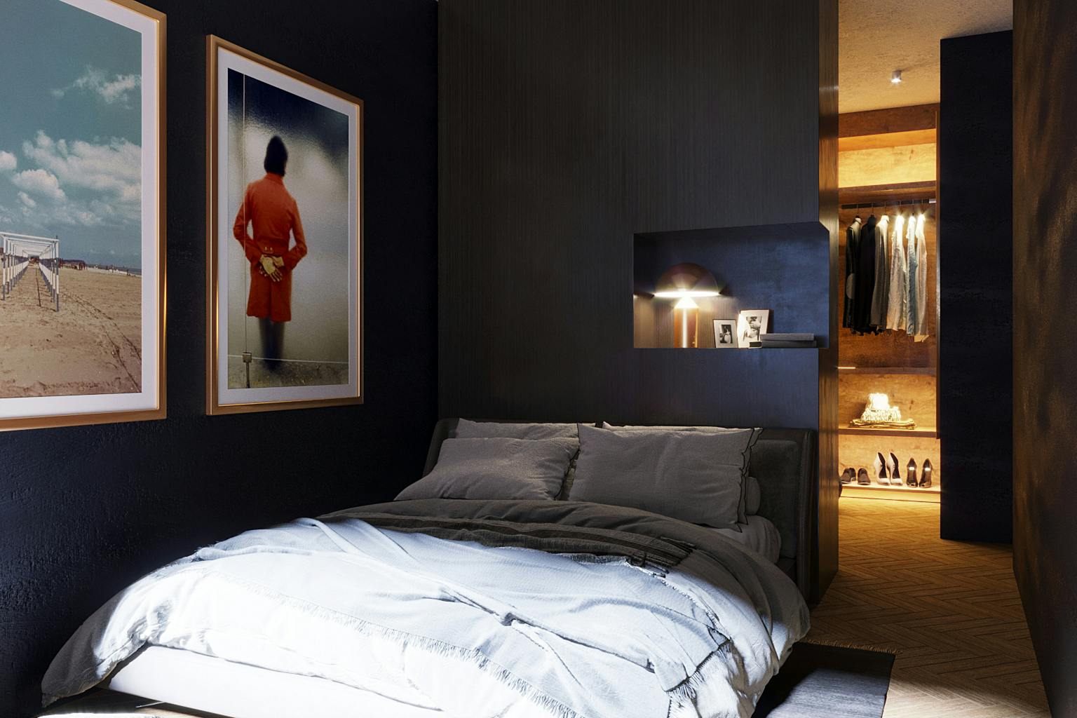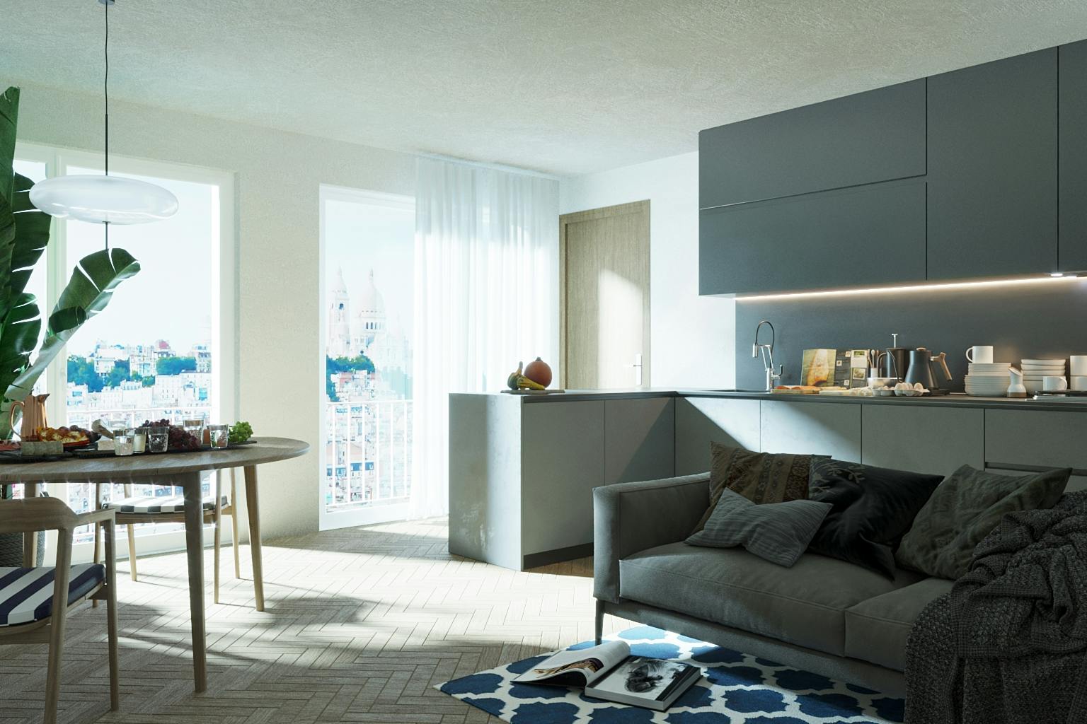 Une jeune agente immobilière achète un appartement dans une tour, à La Chapelle. La vue, sur le Sacré-Cœur, est magnifique, mais le plan n’est pas du tout adapté à ses exigences. Elle voudrait une salle de bain unique et un salon plus grand pour les apéros avec ses amis. Je vais dans la chambre, dit-elle, uniquement pour dormir et pour ranger mes vêtements (nombreux). Le message est clair : le dressing, dans le plan proposé, occupe exceptionnellement la moitié de la chambre et le lit, dans la chambre devenue plus étroite, est tourné vers la baie vitrée. Profiter de la vue partout dans l’appartement.